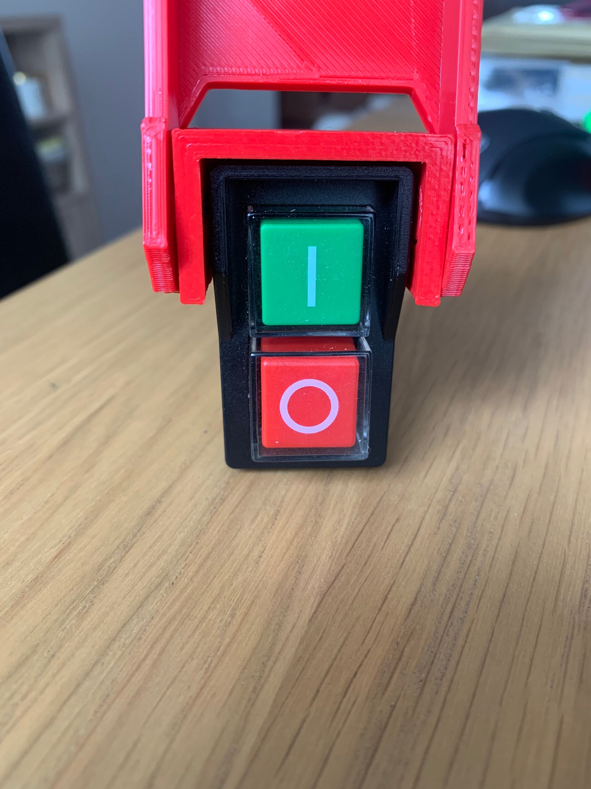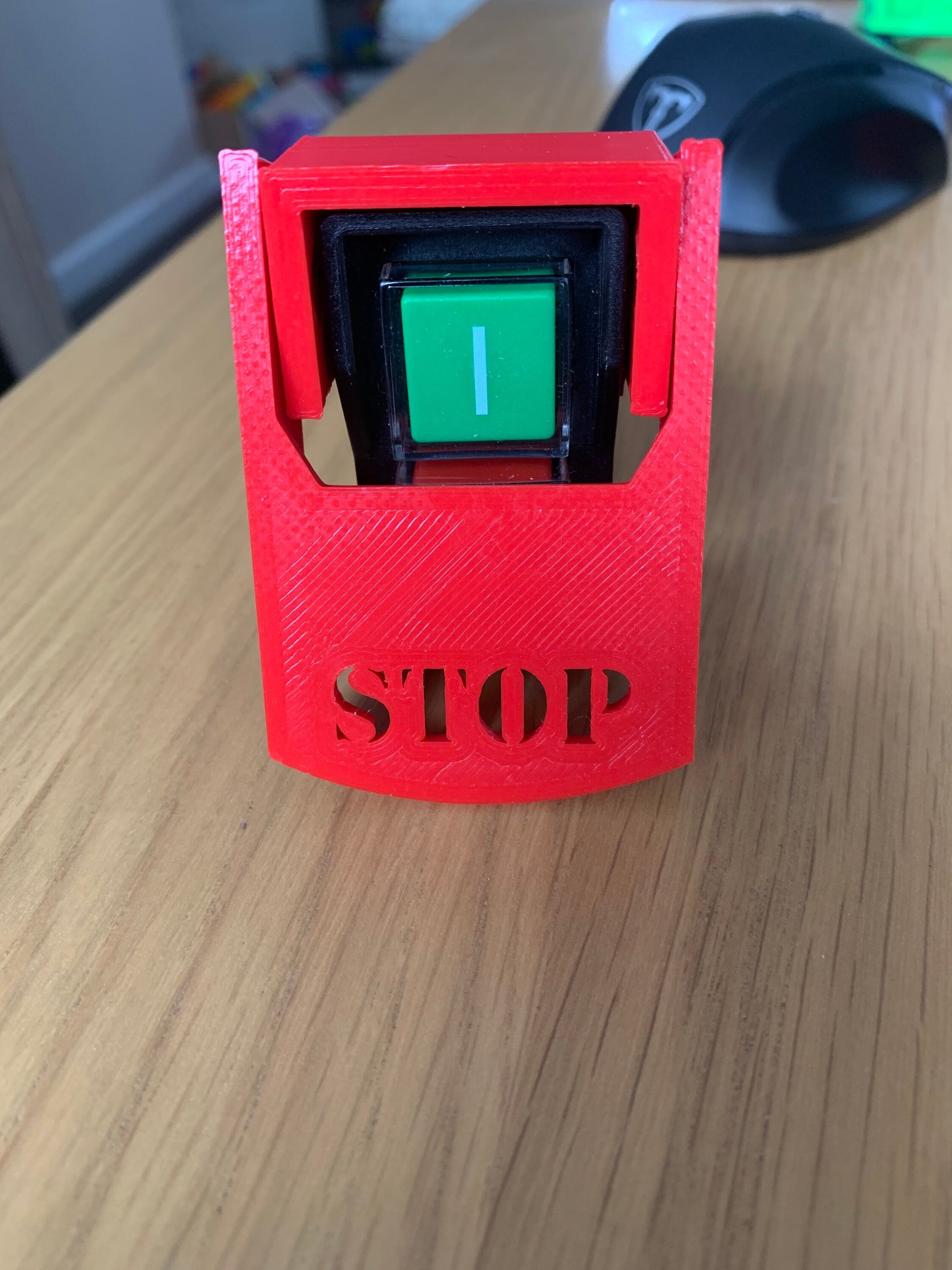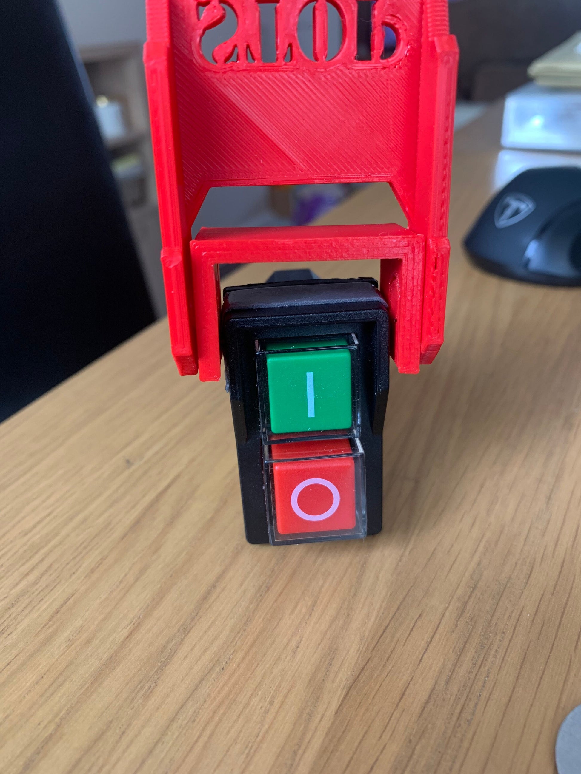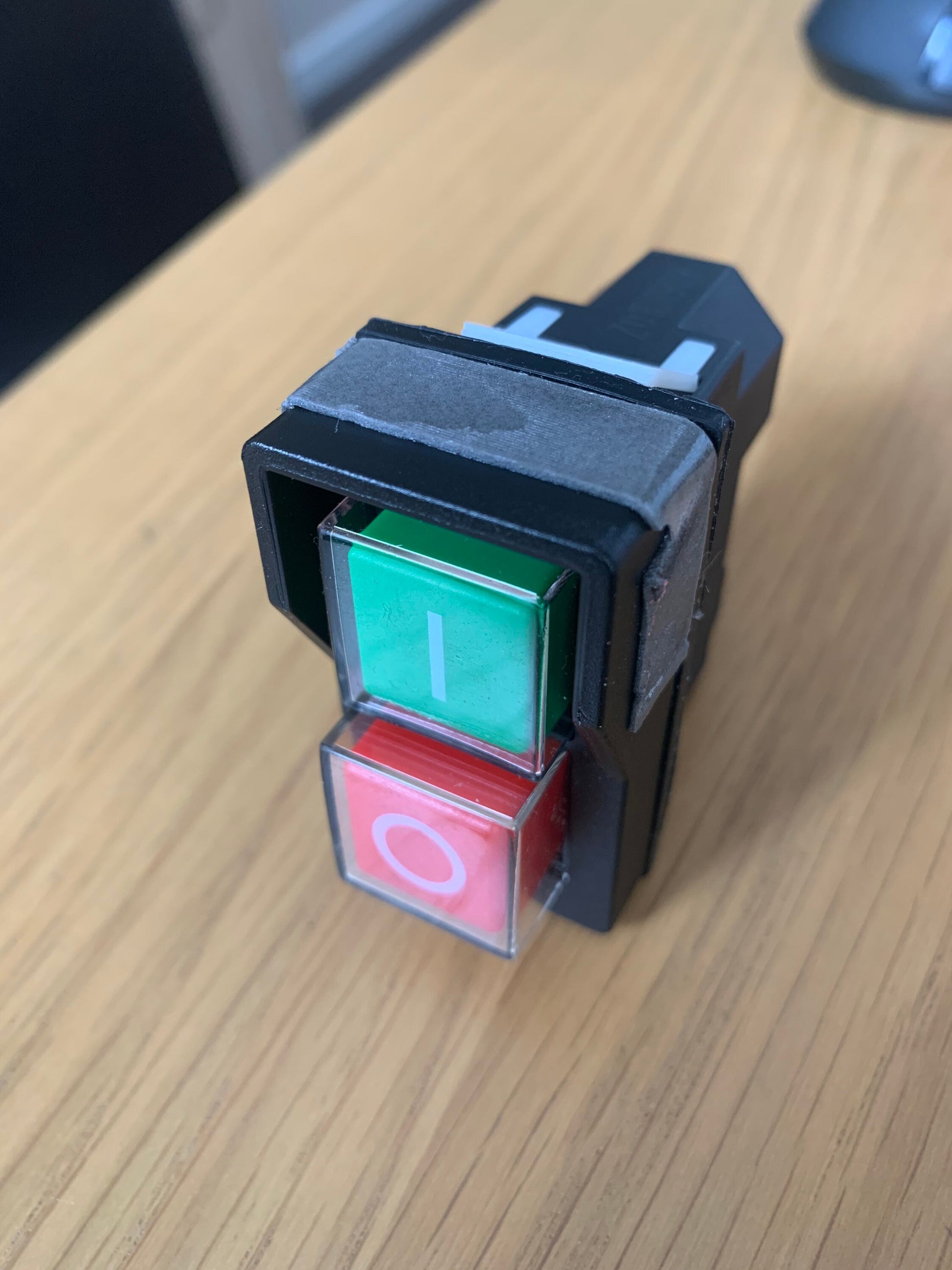Stick the supplied 3m double sided tape over the existing switch peel off the protective layer on the tape and from the top push the emergency stop paddle into position. See pictures.