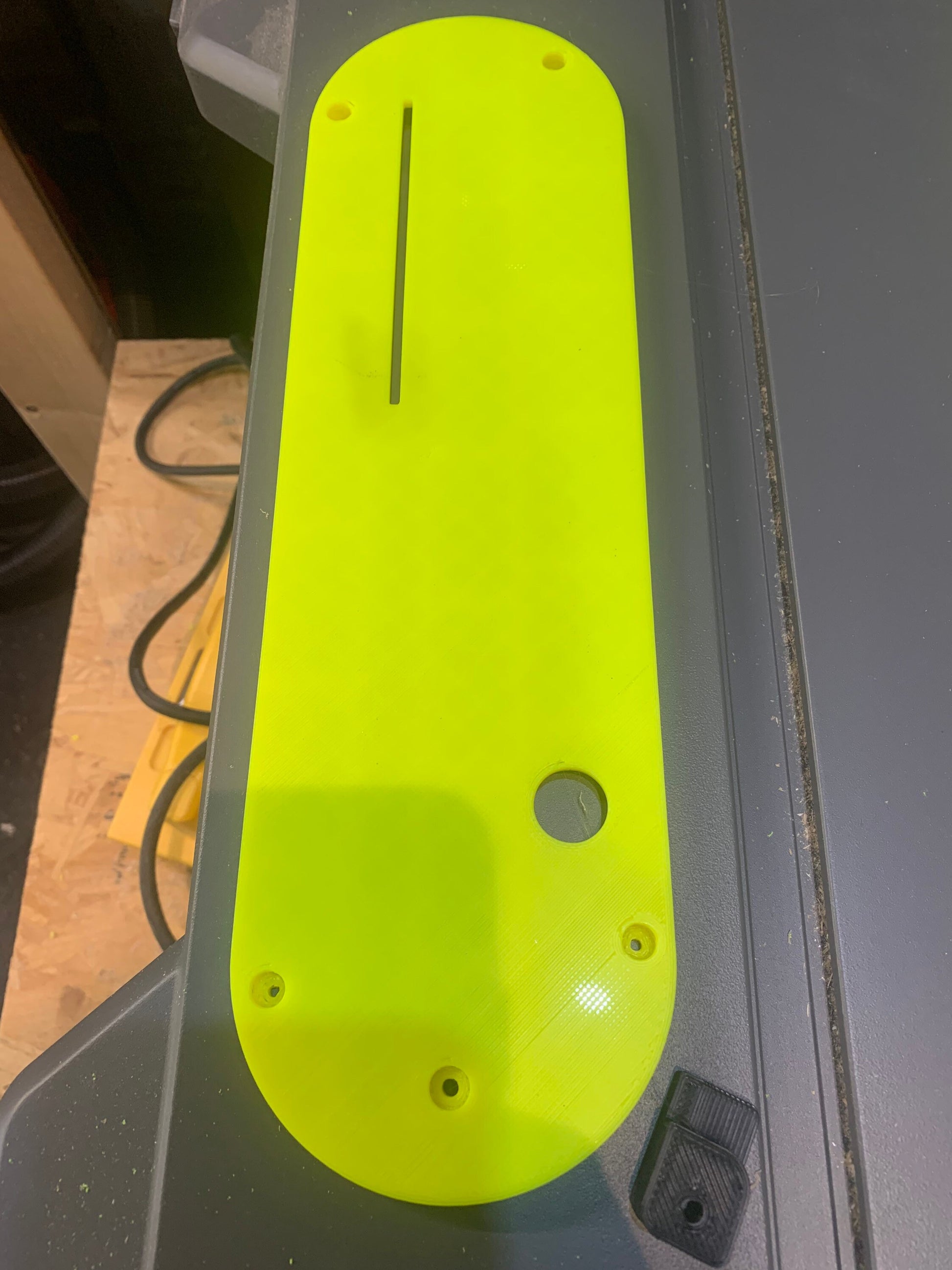 This 3D printed item replaces the wide original blade insert to reduce tear out and allow for cutting thin strips of stock reducing the risk of them falling between the blade guard.