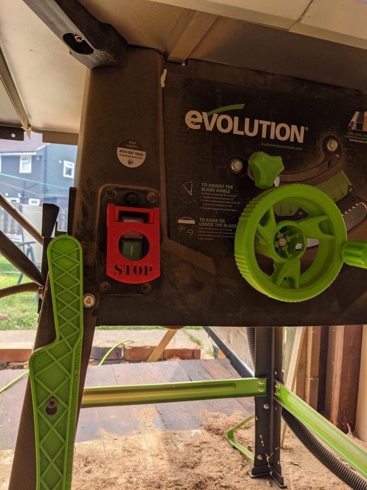 Instead of bending down and looking for the small off button this allows you to just reach down and instantly stop the saw.
